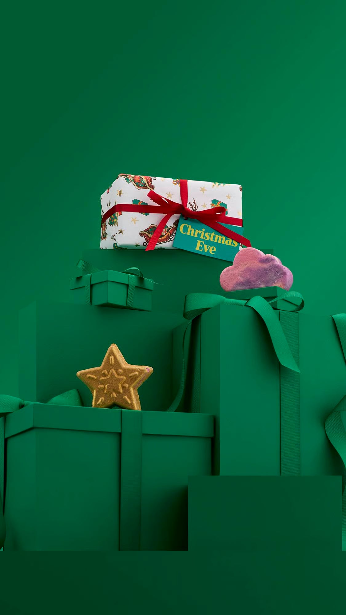 Kate Ellison, Lush Gift Designer, describes this gift as, “A lovely traditional Christmas design ready for the most exciting day of the year. This gift design was inspired by the excitement of waiting for the big present opening on Christmas Day with Santa’s sleigh filled with gifts, Christmas trees and glistening stars to remind you of the night before Christmas and the excitement it brings. It uses beautiful watercolor illustrations and a festive color scheme.”