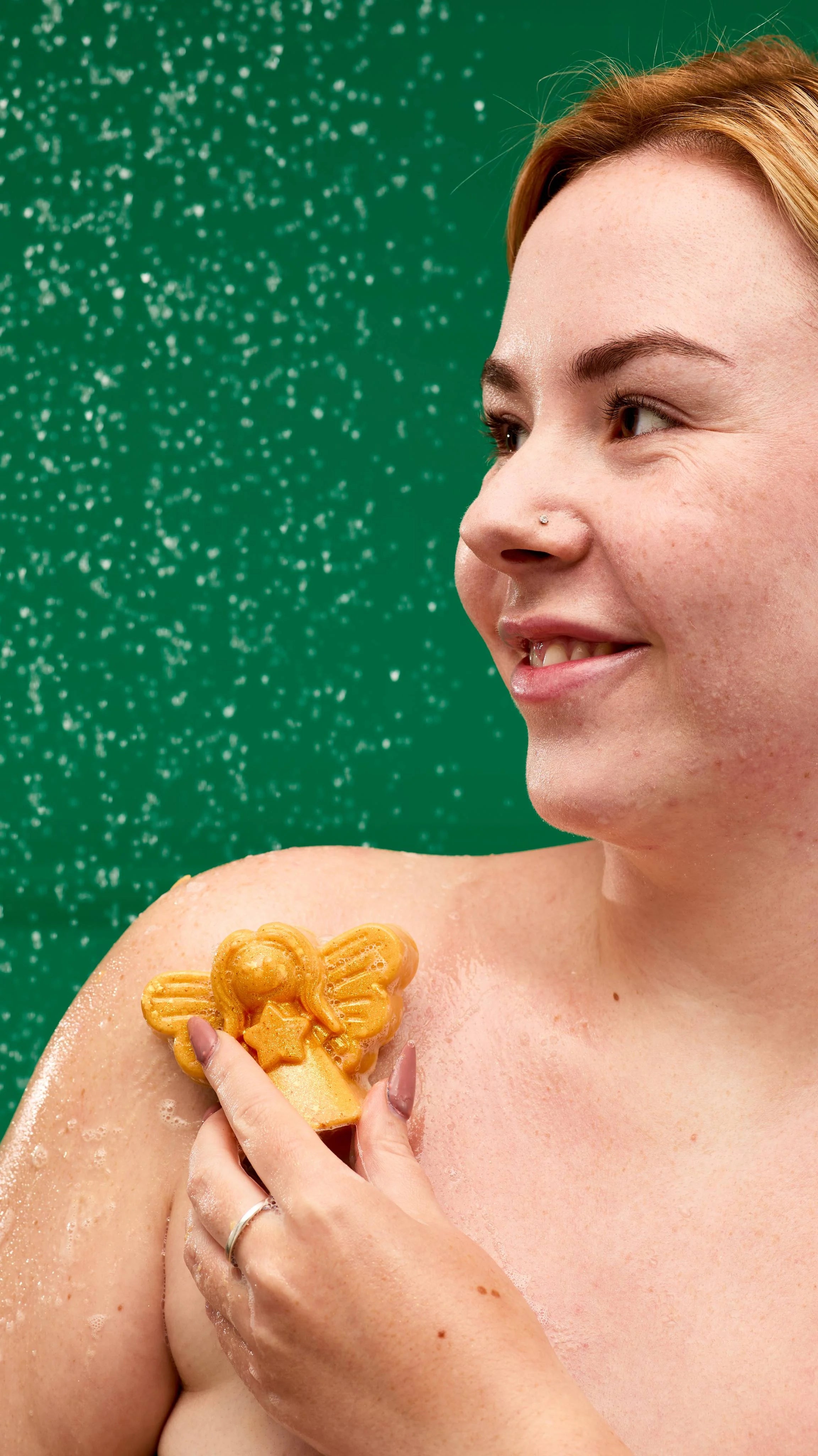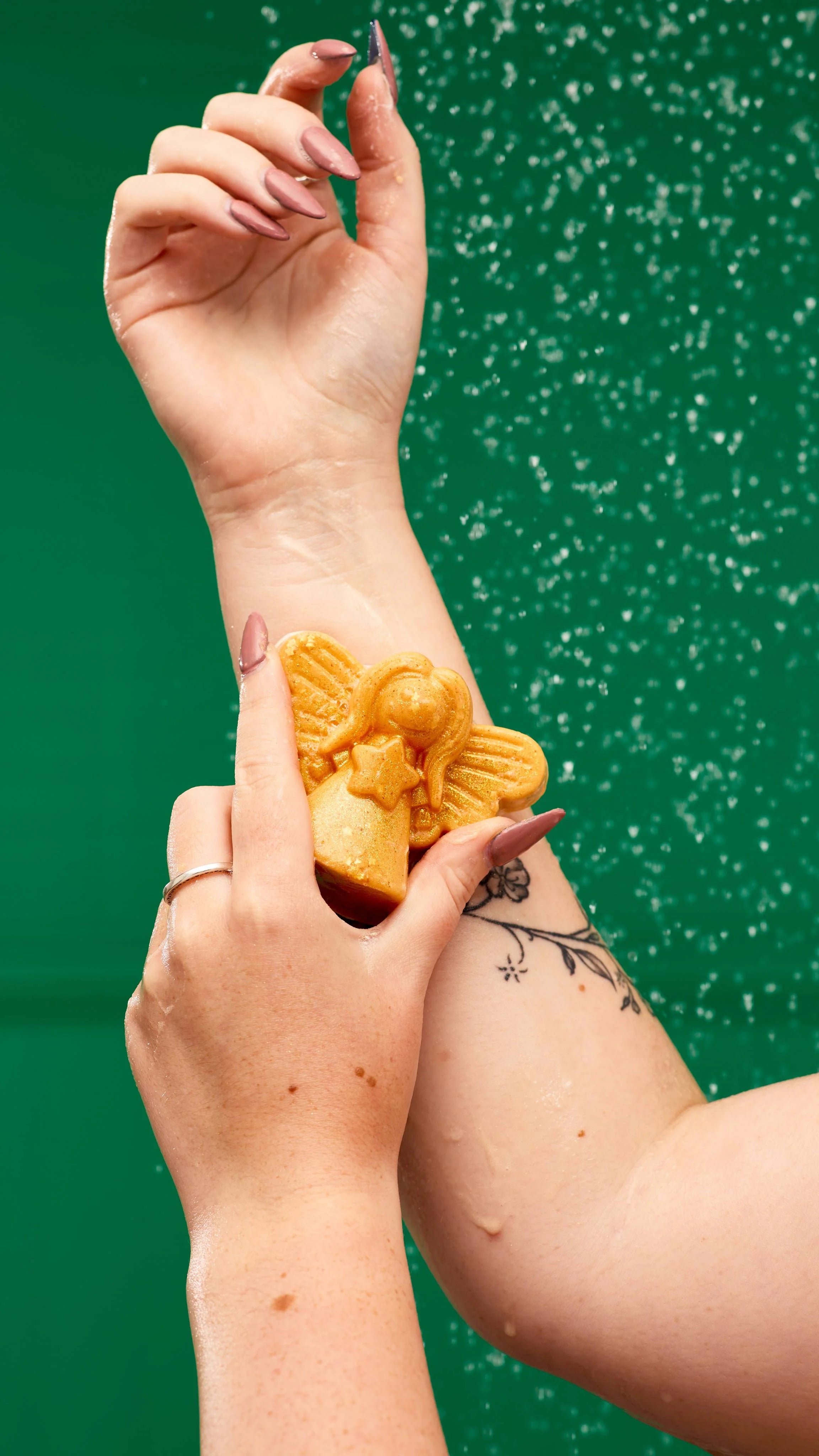 A golden angel graces your soap dish with juicy sweet scents, a touch of sparkle and soothing oat milk. Your wish for soft, scented hands has been granted this Christmas.