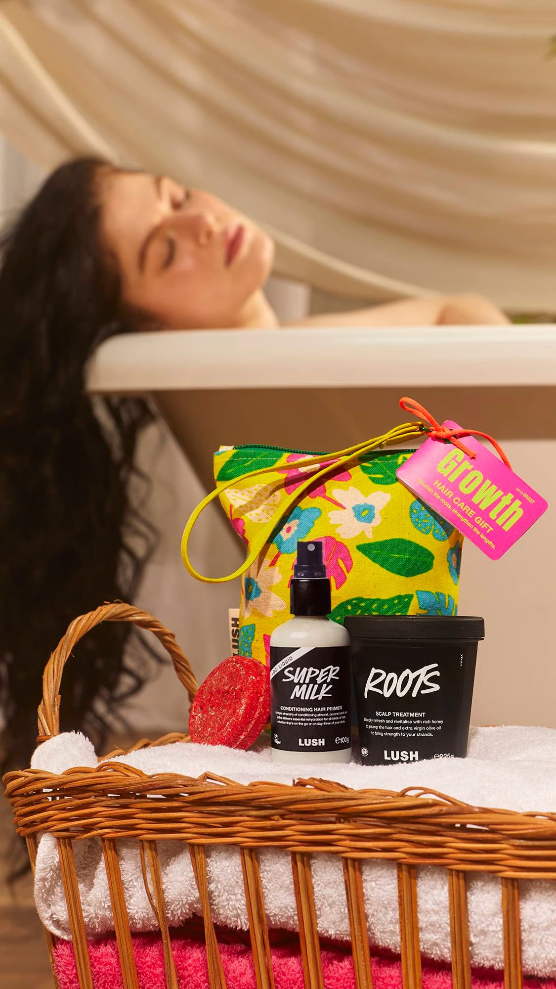 Nurture growing, healthy hair with this invigorating haircare trio in a reusable organic cotton travel bag. Add volume to fine, thin and dull hair with our minty scalp treatment, Roots, then lather up with New, a clove and cinnamon shampoo bar that stimulates the scalp. Finally, treat hair to our bestselling Super Milk Conditioning Hair Primer, a sweetly-scented, triple whammy of conditioning almond, coconut, and oat milks that delivers essential softness and rehydration.