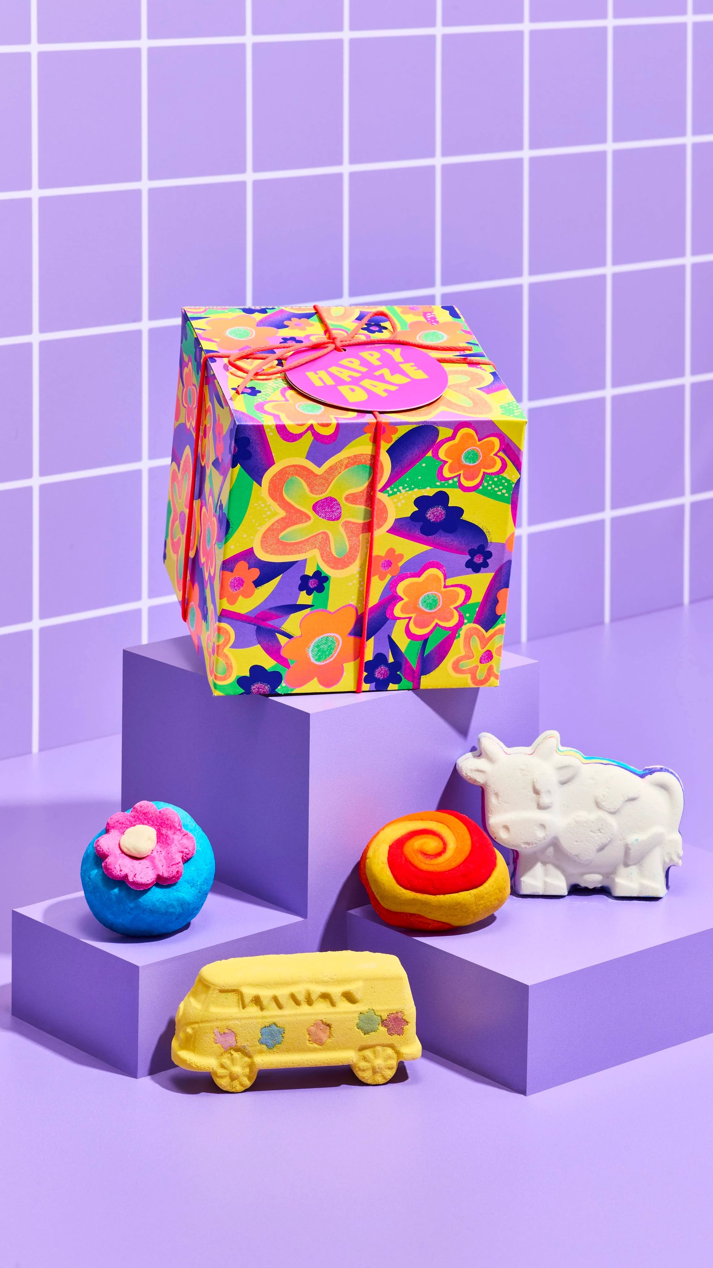 Designed by Gift Designer, Shannon Lund, who drew inspiration from the hippy vibes of the products inside to create this fun '70s retro flower power pattern.