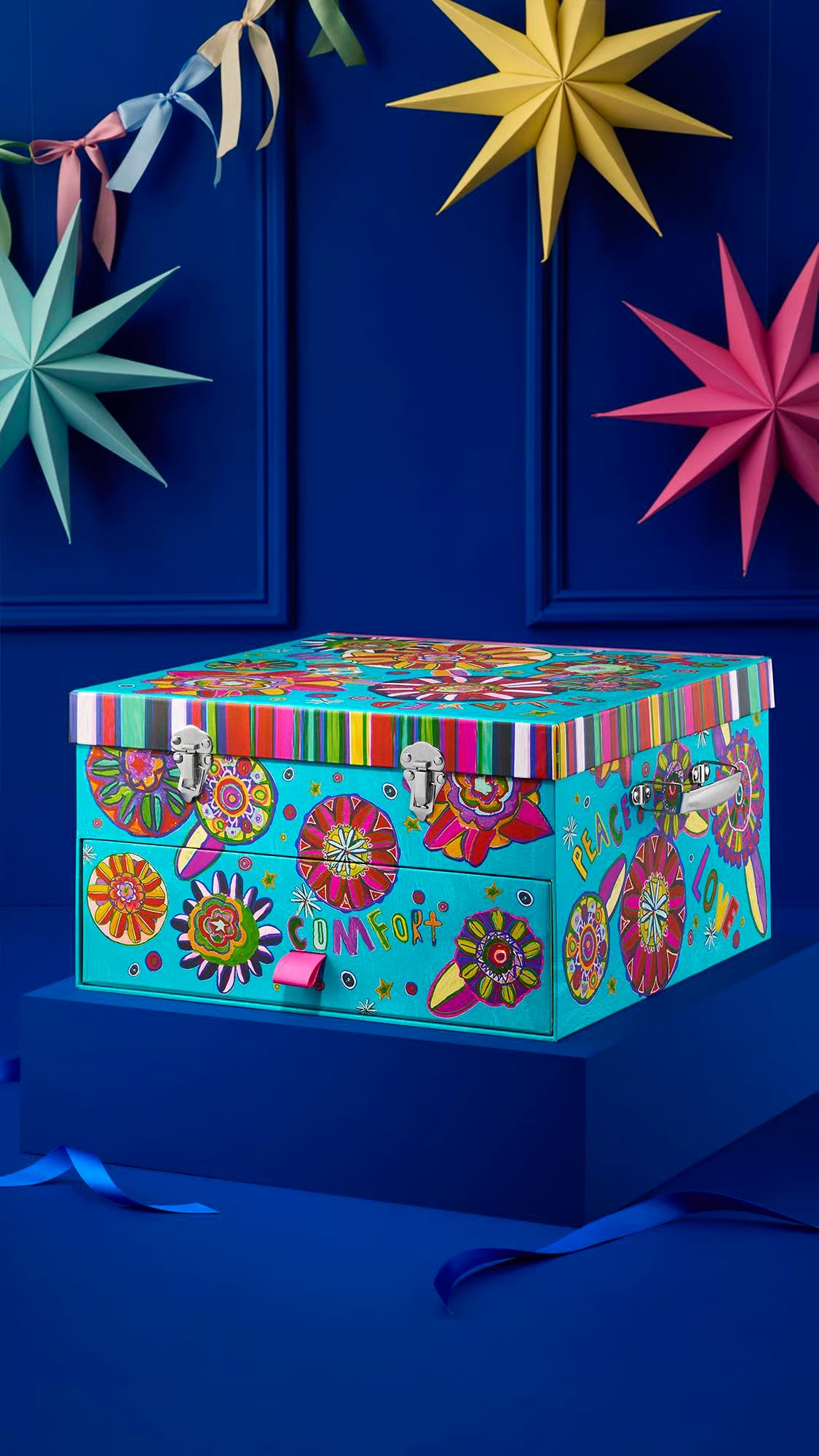 The artwork on this box was created by Shruti Gadhvi, an artist who works with Artbox. Artbox London is a registered charity and social enterprise that runs a program of art workshops to allow those with learning disabilities and neurodivergent artists to explore their creative interests and develop their artistic skills. Shruti says, “When I'm in my area in London and on holiday, I see lots of flowers and color and this gives me ideas for my art. In Artbox I found a book on meditation and combined the flowers and colors with positive words and mandalas to create this piece. The words make my mind and body feel calm and then I feel the flow inside the body when making the art.”