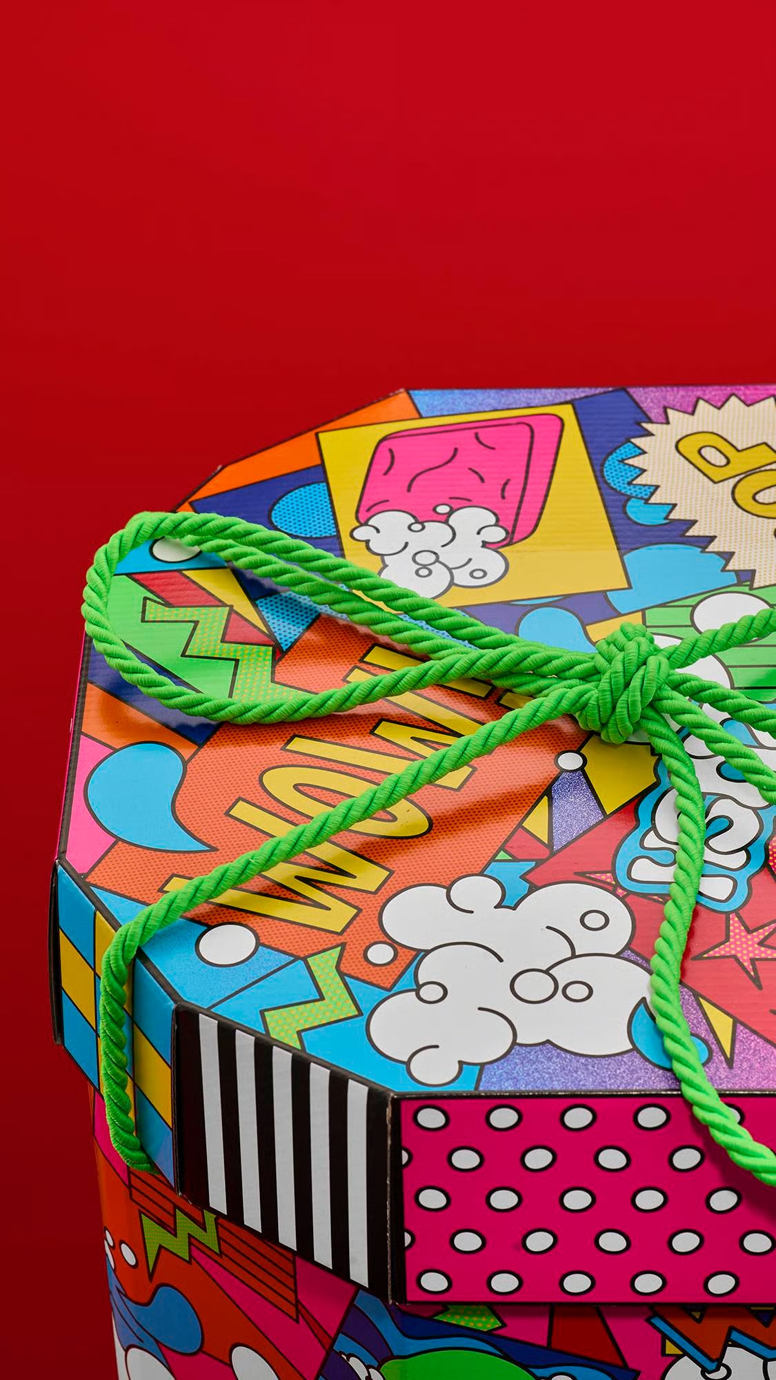 This gift was designed by a collection of designers from Lush U.K. and North America. We heard the following through the grapevine: “Lush meets pop art in a bold, joyful collision of color, pattern, and play! A celebration of bathing as vibrant self-expression through bold blocks of electric color and eye-popping patterns colliding with juicy halftone patterns. A riot of neon nostalgia and joyful illustrations that turn every splash, soak, scrub into a pop-powered masterpiece.”