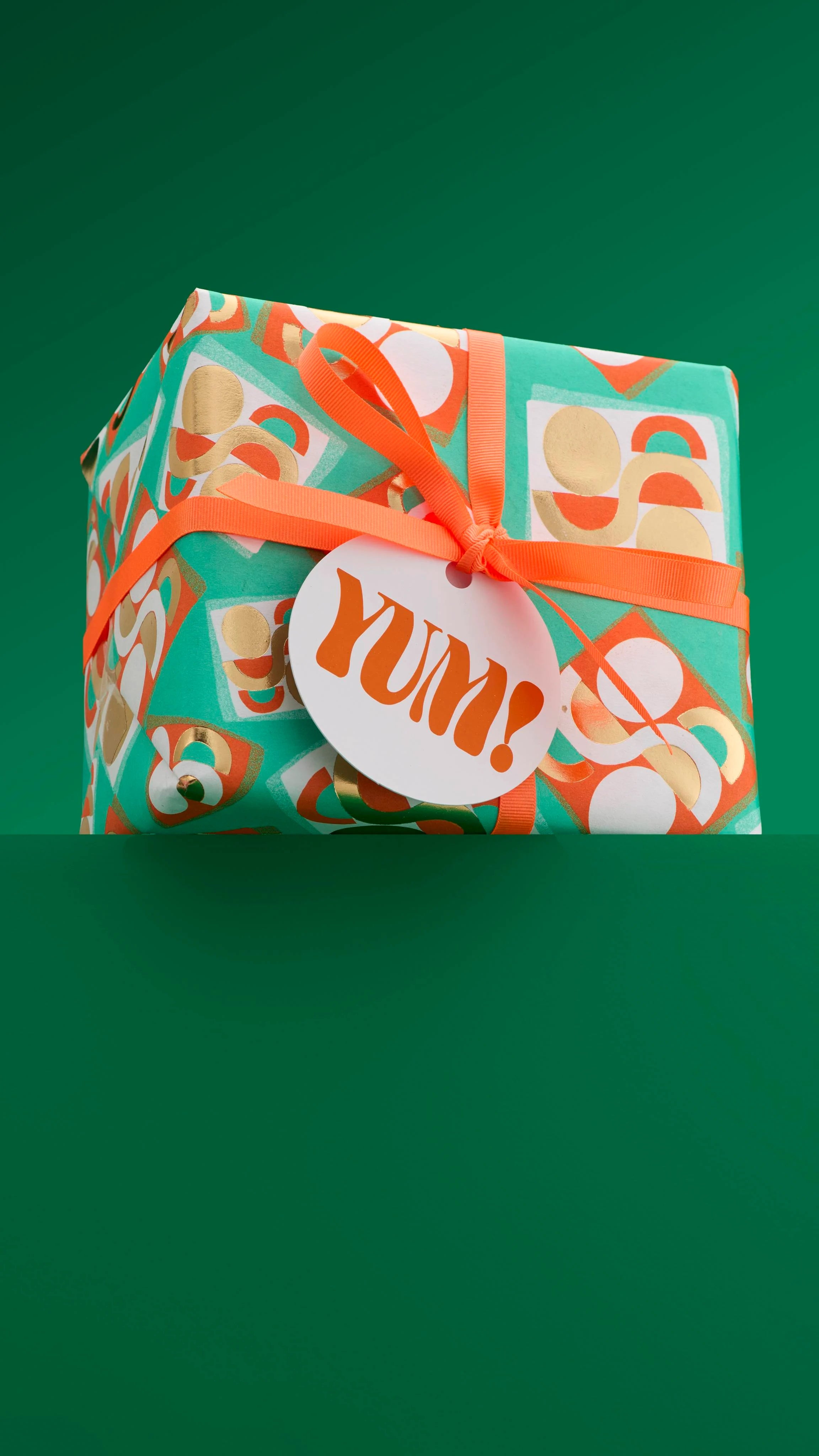 Gift Designer, Shannon Lund designed this gift with, “playful abstract shapes and vibrant colors to create a festive pattern that subtly evokes the sweetness and joy of classic Christmas treats.”